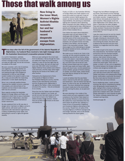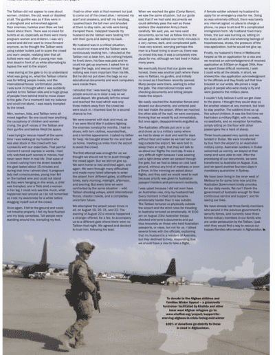 This is an account by an Afghani woman, Khalida, who with her husband, escaped from Kabul Afghanistan in August last year when the US, Australian and allied forces withdrew, and the Taliban took control. The Westsider has, appropriately, treated this with a major splash over two pages. Khalida gives a harrowing first person account of her experience of that terrible time in Kabul and their dangerous escape. It also gives us a detailed insight into how the Australian government and the Ministry of Foreign Affairs worked on the ground in Kabul to try and get people out to Australia; something we hadn’t really heard before. The story is harrowing, and I commend Khalida and the paper for telling it in a way that is very informative but also deeply personal. Having lived through such a traumatic experience, it would have been very difficult for Khalida to write this story, to relive that trauma. Not knowing whether they would live or die. Not knowing whether they would be trapped in Afghanistan under the Taliban with their lives at risk. It’s a harrowing tale but it’s also very important because it does give us a firsthand account of what it was like being in that situation at that time. We all saw it on the news, we were all outraged. We saw people clinging to the aeroplanes as they took off from the airport and falling to the ground. And here is Khalida, now living in the inner west of Melbourne with her husband who was in that situation at that time telling us exactly what it was like. There is excellent use of photographs, a reminder of just how terrifying that situation was, and the layout is really quite special. Thank you, Khalida, for your bravery in sharing your story with us and we wish you all the best. It’s also a reminder, when we watch things on the news that are occurring on the other side of the world, that the people involved could end up living next door to you or standing next to you in the supermarket queue. This story is a reminder of that. Congratulations to The Westsider and congratulations to Khalida and her husband and full credit to you for that determination to get through but thank you for sharing your story with us.