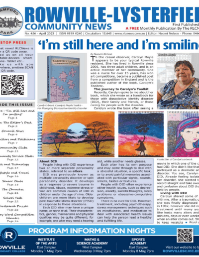 ‘I’m still here and I’m smiling’, story Naomi Nelson,A remarkable story about a woman with dissociative identity disorder (DID). Carolyn Moyle experiences multiple, separate personality states, referred to as alters, a coping mechanism after a traumatic childhood. Journalist Naomi Nelson and Rowville-Lysterfield Community News have approached, written and presented this story with sensitivity, care and intelligence. The writing is beautifully simple and clear. It is captivating. Ms Moyle can lose minutes, days or evens weeks when an alter comes out. She maintains a communication book so the alters can communicate with each other and her and she with them. During the interview, one of her alters comes out to answer a question. The journalist includes the encounter in the story, handling it sensitively and respectfully. The feature includes an excellent break-out story on the condition itself and examples of Ms Moyle’s art. The layout, a little busy, gets many things right, including the heading and hero pics of Ms Moyle and her book at the top. The newspaper, rightly, has splashed this story on the front page, at the same time handling it with care, sensitivity, intelligence and maturity. Well done.