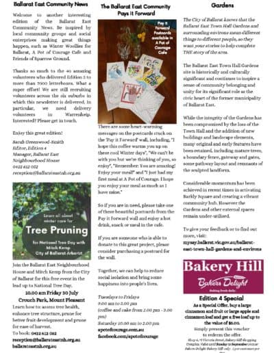 Workshops run by Ballarat Wholefoods Collective and notes about the Community Garden, the local Lions Club and Neighbourhood Houses, ParkRun, VicSwim and Auskick certainly give the community plenty of information about how to participate in local activities which bring the community together.